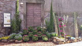 Ho realizzato questo allestimento usando materiali poveri , quali pali di castagno legna di quercia e fioriture del periodo , i cesti sono di un'artigiano fatti a mano con canne e vimini e la corteccia a terra ha fatto una buona base per i tronchetti di legno, le canne appoggiate al muro fanno da richiamo hai cesti . A questi materiali ho unito fioriture appariscenti del periodo quali gerani francesini asteriscus felicia e piccoli pelargoni . L'effetto è piaciuto molto specialmente ai turisti che si sono fermati li per fare le foto ricordo , il tutto in un'ambiente molto suggestivo quale il Centro di Viterbo "La Città dei Papi" . Le mura che vedete come sfondo sono delle mura Etrusche.